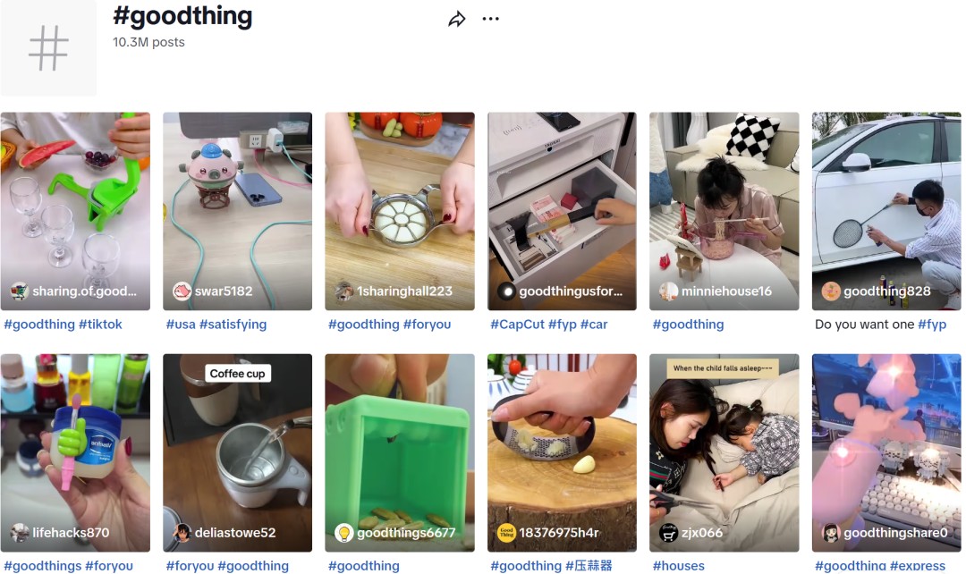 TT123 發現,在 TikTok 上,關於 #lifehacks 生活小竅門、#goodthing 好物分享、#useful tools 有用的工具等一些日常生活話題的熱度非常高。其中,帶有#生活小竅門標籤話題的曝光量已超過 1566.65 億次,相關視頻數量達到 410 萬條;帶有#好物分享話題的瀏覽量超過 1225.97 億次,相關視頻帖子數量超過 1000 萬條。
