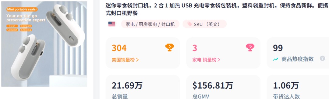 在跨境電商領域,用户需求成為唯一的風口。隨着市場飽和和競爭加劇,越來越多的賣家開始關注細分需求,推出 “小而精” 的產品。在 TikTok 上,關於生活小竅門和好物分享的話題熱度高,相關視頻曝光量巨大。近期,一款迷你零食袋封口機在 TikTok 美國市場銷售火爆,過去 28 天售出 1.33 萬件,銷售額達 10.53 萬美元,成為家電銷量榜第三名。