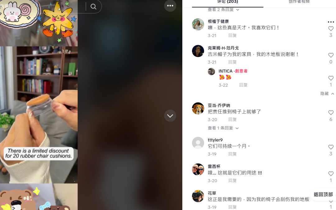 在 TikTok 上,許多使用過的用户,紛紛成為這個款椅子橡膠腳墊的自來水,發佈 “種草” 視頻,並表示,“你永遠不會想到這件小事,直到你拖動椅子。” 一些網友在相關視頻留言區評論道: