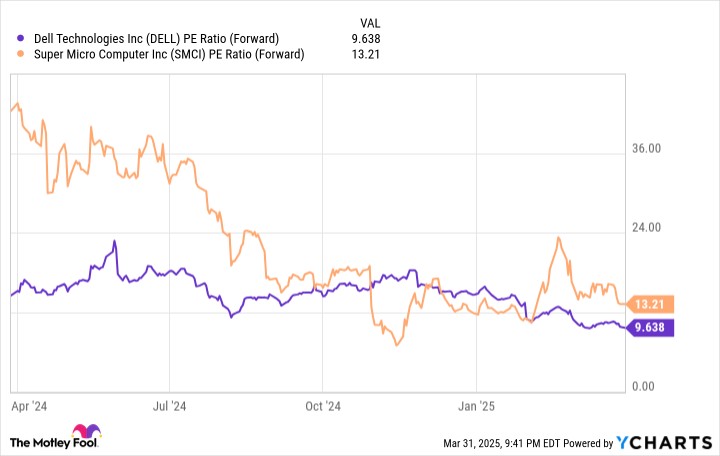 Dell and Super Micro Computer are key players in the AI server market, with Dell trading at a forward P/E of 9.6, making it appear cheaper than Supermicro's 13.2. However, Dell's growth may be slower due to its diverse business units, while Supermicro is expected to grow faster but carries risks from recent accounting issues and a probe related to Nvidia processors. Dell is considered the safer investment, while Supermicro offers riskier growth potential.
