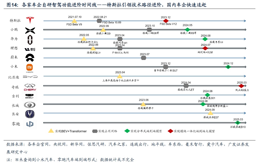Major automakers have made significant progress in developing their own intelligent driving features. Tesla was the first to achieve BEV+Transformer technology in July 2021 and made a breakthrough in integrated end-to-end technology in December 2023. Domestic automakers such as Huawei, Li Auto, and XPeng are also rapidly catching up, achieving related technologies at different time points, and are expected to launch more innovative technologies in the coming years