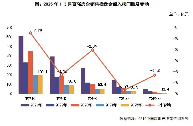 In March 2025, the sales thresholds for each tier of the top 100 real estate companies decreased. Among them, the sales turnover thresholds for the TOP 20 and TOP 30 real estate companies decreased by 4.3% and 2% year-on-year to 9 billion yuan and 5.34 billion yuan, respectively. The thresholds for the TOP 50 and TOP 100 real estate companies decreased by 5.7% and 4.3% year-on-year to 3.09 billion yuan and 1.24 billion yuan, respectively.