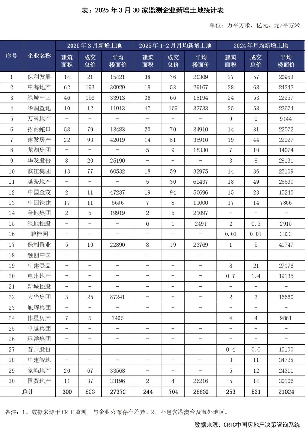 According to the CRIC real estate research report, the overall Chinese real estate market will remain at a low level in March 2025, with the performance of the top 100 real estate companies increasing by 68.9% month-on-month. The sales amount of the TOP 100 real estate companies reached 317.76 billion yuan, with the monthly performance scale still at a historical low. Although nearly 70% of companies experienced a month-on-month decline in overall performance, the TOP 30 real estate companies performed well, achieving positive growth in monthly performance. The land acquisition efforts of key monitored companies continue to recover, with 30 real estate companies' monthly investment amount approaching 82.3 billion yuan