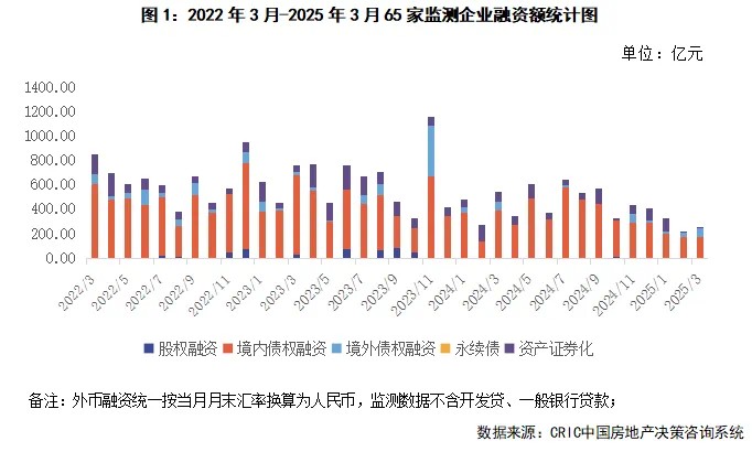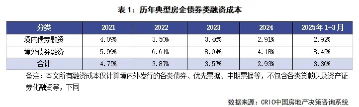 Financing costs: From January to March 2025, the new bond financing cost for 65 typical real estate companies was 3.36%, an increase of 0.43 percentage points compared to 2024, with the cost of overseas bond financing at 8.45%, an increase of 4.27 percentage points compared to the whole of 2024, and the cost of domestic bond financing at 2.92%, an increase of 0.01 percentage points compared to the whole of 2024 In terms of the month, there were no corporate overseas bond issuances this month. Since the companies issuing bonds domestically are mainly state-owned enterprises such as Shoukai, China Communications Construction, and Joy City, the domestic bond financing cost increased by 0.42 percentage points month-on-month to 3.11%, remaining at a low level overall.