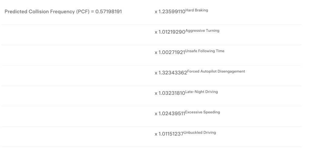 特斯拉採用下圖所示的公式,稱為預測碰撞頻率(PCF),並將其轉換為基於駕駛員行為分配的 0 到 100 的版本 2.2 安全評分。2.1 安全評分公式也可以在特斯拉保險頁面上看到,下面的公式是新推出的版本 2.2。