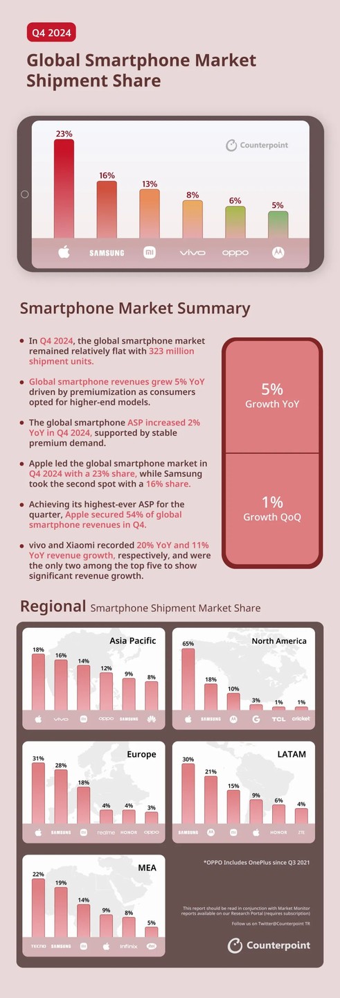 Counterpoint Research: In the fourth quarter of 2024, global smartphone shipments reached 323 million units, with revenue increasing by 5% year-on-year under the trend of premiumization