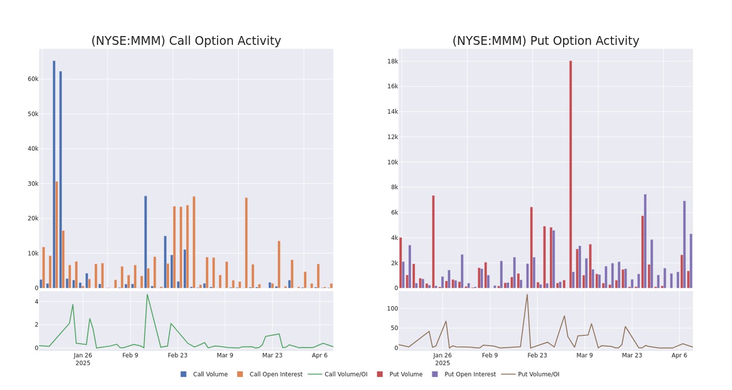 Deep-pocketed investors have adopted a bullish approach towards 3M MMM, and it's something market players shouldn't ignore. Our tracking of public options records at Benzinga unveiled this significant move today. The identity of these investors remains unknown, but such a substantial move in MMM usually suggests something big is about to happen.