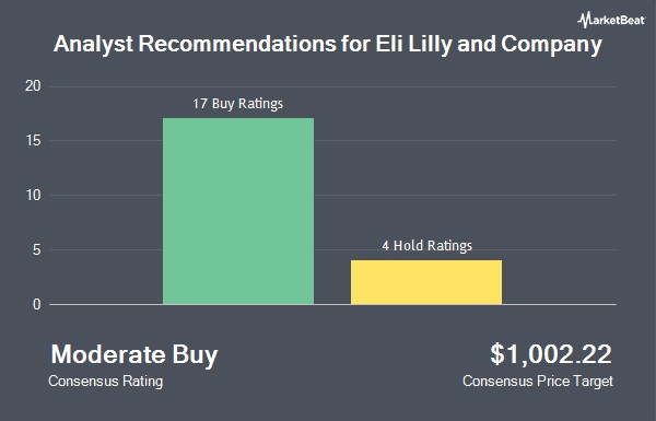 Shares of Eli Lilly and Company (NYSE:LLY - Get Free Report) have received an average rating of "Moderate Buy" from the nineteen ratings firms that are currently covering the company, MarketBeat.com reports. Two equities research analysts have rated the stock with a hold rating and seventeen have issued a buy rating on the company. The average 12 month price target among brokerages that have covered the stock in the last year is $1,017.67.
