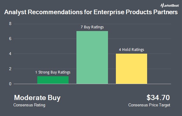 Shares of Enterprise Products Partners L.P. (NYSE:EPD - Get Free Report) have been assigned an average rating of "Moderate Buy" from the eleven research firms that are presently covering the company, MarketBeat reports. Four analysts have rated the stock with a hold recommendation, six have assigned a buy recommendation and one has issued a strong buy recommendation on the company. The average 1 year price objective among brokers that have updated their coverage on the stock in the last year is $36.89.