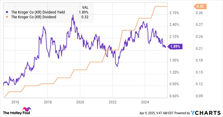 克羅格作為一隻股息增長股票脱穎而出,在過去五年中將季度支付翻倍,當前每股支付為 0.32 美元,收益率為 1.9%。