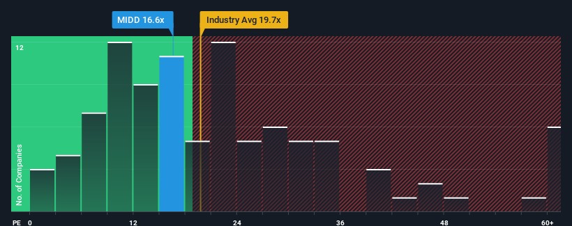 With a median price-to-earnings (or "P/E") ratio of close to 16x in the United States, you could be forgiven for feeling indifferent about The Middleby Corporation's (NASDAQ:MIDD) P/E ratio of 16.6x. Although, it's not wise to simply ignore the P/E without explanation as investors may be disregarding a distinct opportunity or a costly mistake.