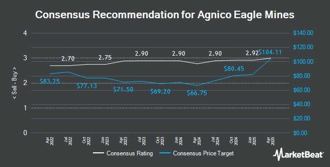 AEM has been the subject of several other reports. Royal Bank of Canada increased their price objective on Agnico Eagle Mines from $110.00 to $115.00 and gave the stock an "outperform" rating in a research note on Friday, April 4th. Scotiabank lifted their price target on shares of Agnico Eagle Mines from $103.00 to $105.00 and gave the company a "sector outperform" rating in a report on Tuesday, January 21st. Citigroup upped their price objective on shares of Agnico Eagle Mines from $100.00 to $140.00 and gave the stock a "buy" rating in a research note on Monday, March 31st. Stifel Canada upgraded shares of Agnico Eagle Mines to a "strong-buy" rating in a research note on Wednesday, March 19th. Finally, StockNews.com lowered Agnico Eagle Mines from a "strong-buy" rating to a "buy" rating in a research report on Tuesday, February 25th. Two research analysts have rated the stock with a hold rating, eight have assigned a buy rating and two have assigned a strong buy rating to the company's stock. Based on data from MarketBeat.com, Agnico Eagle Mines presently has an average rating of "Buy" and an average price target of $111.90.