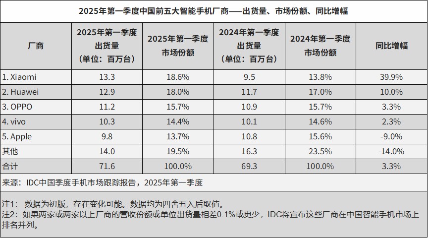 Market Performance of China's Top Five Smartphone Manufacturers in Q1 2025