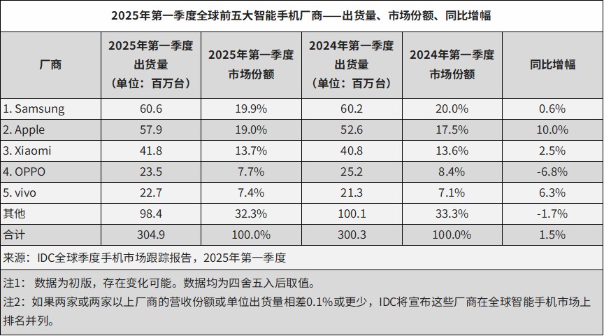 In the first quarter of 2025, global smartphone shipments increased by 1.5% year-on-year, reaching 304.9 million units, in line with IDC's forecast. Manufacturers increased production to cope with the U.S. tariffs on Chinese goods, especially for the U.S. market. Although the U.S. government has suspended tariffs on Chinese smartphones, future economic uncertainties may dampen consumer demand. Chinese manufacturers performed well in the domestic market, with major manufacturers like Samsung achieving year-on-year growth