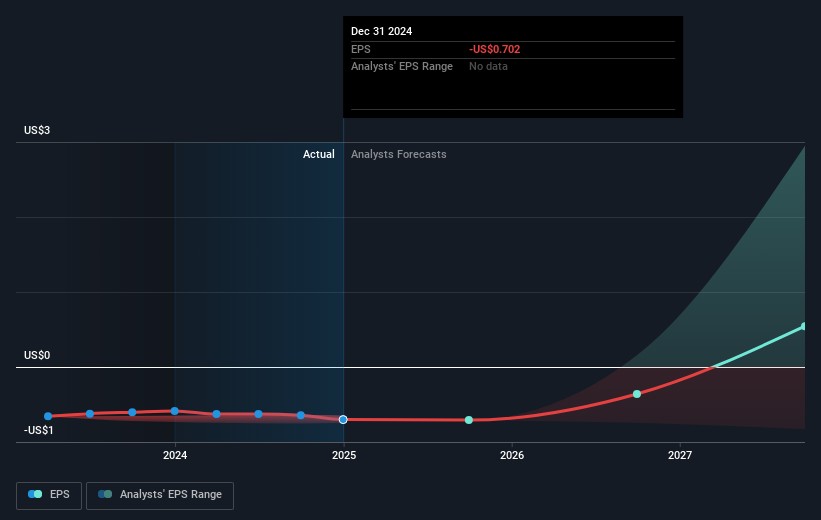 According to the 3 industry analysts covering ESSA Pharma, the consensus is that breakeven is near. They anticipate the company to incur a final loss in 2026, before generating positive profits of US$36m in 2027. Therefore, the company is expected to breakeven roughly 2 years from today. How fast will the company have to grow each year in order to reach the breakeven point by 2027? Working backwards from analyst estimates, it turns out that they expect the company to grow 59% year-on-year, on average, which is extremely buoyant. If this rate turns out to be too aggressive, the company may become profitable much later than analysts predict.