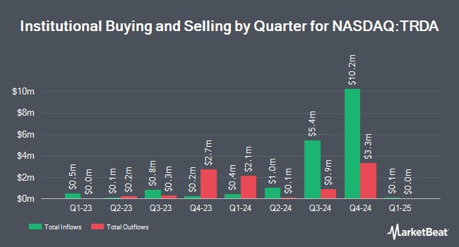 Several other large investors have also recently added to or reduced their stakes in TRDA. Vanguard Group Inc. grew its stake in shares of Entrada Therapeutics by 19.7% in the 4th quarter. Vanguard Group Inc. now owns 1,464,237 shares of the company's stock valued at $25,317,000 after buying an additional 241,052 shares in the last quarter. Geode Capital Management LLC grew its position in Entrada Therapeutics by 8.8% in the third quarter. Geode Capital Management LLC now owns 576,451 shares of the company's stock worth $9,214,000 after acquiring an additional 46,512 shares in the last quarter. State Street Corp grew its position in Entrada Therapeutics by 5.5% in the third quarter. State Street Corp now owns 469,601 shares of the company's stock worth $7,504,000 after acquiring an additional 24,385 shares in the last quarter. Arrowstreet Capital Limited Partnership increased its stake in shares of Entrada Therapeutics by 123.2% during the 4th quarter. Arrowstreet Capital Limited Partnership now owns 222,520 shares of the company's stock worth $3,847,000 after purchasing an additional 122,823 shares during the last quarter. Finally, Charles Schwab Investment Management Inc. raised its holdings in shares of Entrada Therapeutics by 6.0% during the 4th quarter. Charles Schwab Investment Management Inc. now owns 197,127 shares of the company's stock valued at $3,408,000 after purchasing an additional 11,143 shares in the last quarter. Institutional investors and hedge funds own 86.39% of the company's stock.