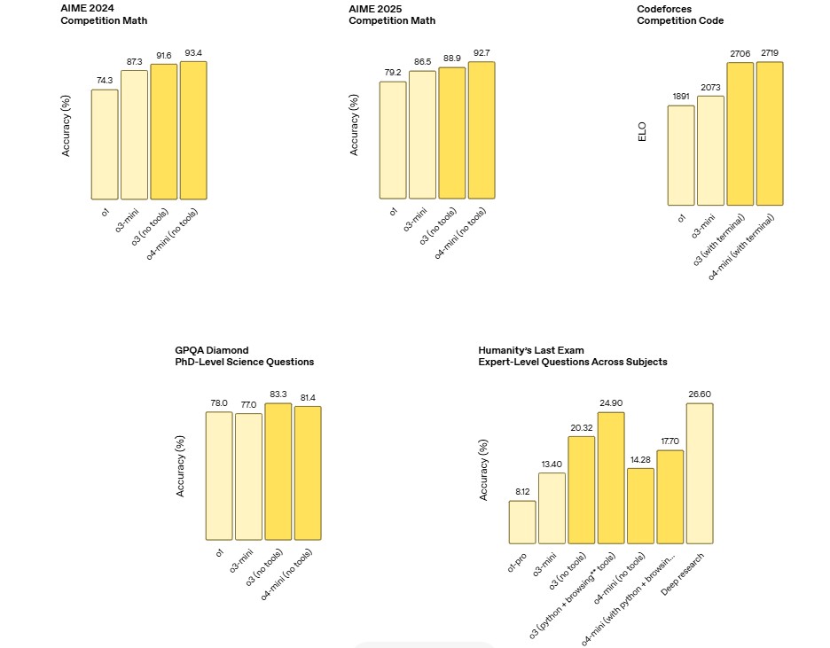 Compared to the full-version o3, o4-mini stands out with its compact efficiency and high cost-performance ratio. In the AIME 2025 test, o4-mini achieved a high score of 99.5% in conjunction with the Python interpreter, almost perfectly acing this benchmark test. Moreover, its performance in mathematics, programming, visual tasks, and non-STEM fields surpasses that of o3-mini. Additionally, o4-mini supports usage limits far exceeding those of o3, making it the optimal choice for high-frequency AI usage scenarios.