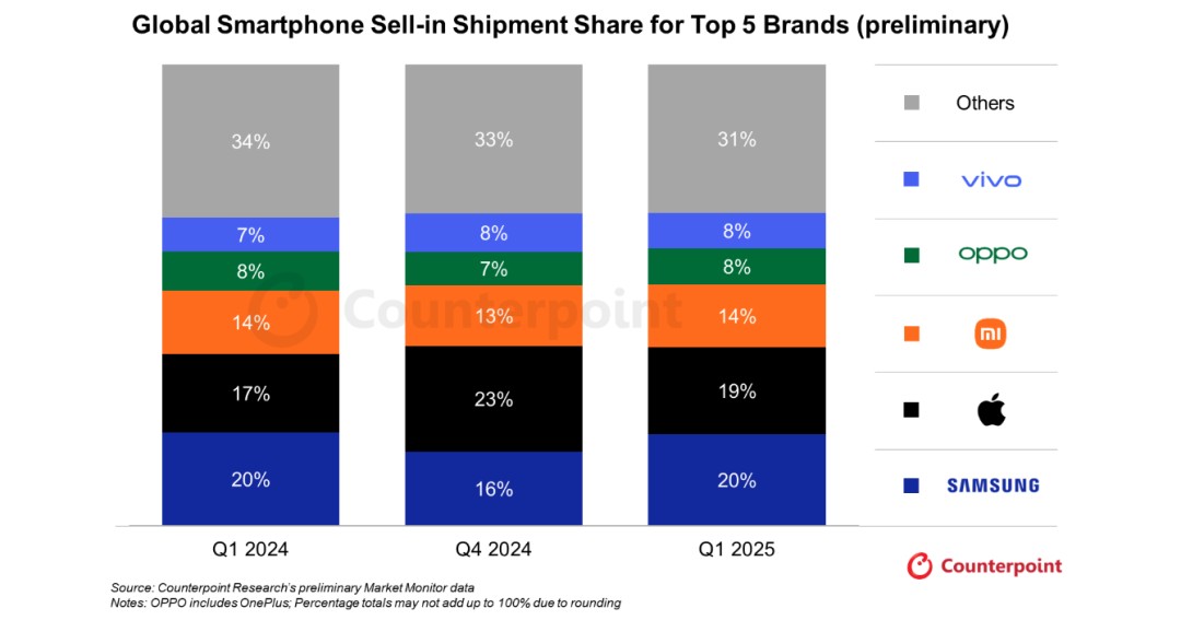 Notes: OPPO includes OnePlus, and the total percentage may not equal 100% due to rounding.