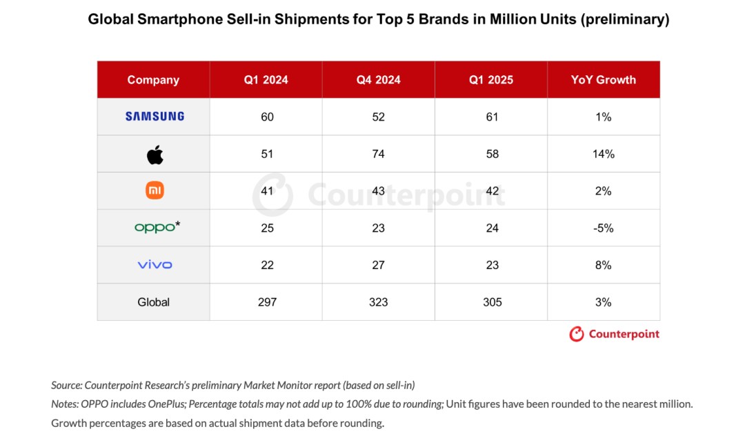 Commenting on the market performance, Counterpoint Senior Analyst Yang Wang stated, "The Q1 growth rate did not meet our previous expectation of 6%, mainly due to increased uncertainty regarding tariff policies at the end of the quarter and manufacturers adopting cautious inventory strategies. Current market uncertainties still exist, which will affect future trends. Therefore, our previous forecast of a 4% growth rate for 2025 is likely to be difficult to achieve, and there may even be zero or negative growth this year."