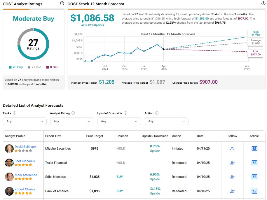 Turning to Wall Street, COST stock has a Moderate Buy consensus rating based on 20 Buys and seven Holds assigned in the last three months. At $1,086.58, the average Costco price target implies a 12.28% upside potential. Shares of the company have gained 9.6% over the past six months.