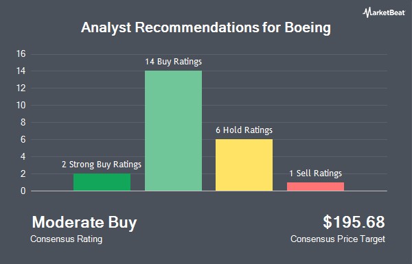 The Boeing Company (NYSE:BA - Get Free Report) has been assigned a consensus recommendation of "Moderate Buy" from the twenty-three brokerages that are covering the company, Marketbeat Ratings reports. One research analyst has rated the stock with a sell rating, six have issued a hold rating, fourteen have issued a buy rating and two have given a strong buy rating to the company. The average 1-year target price among brokerages that have issued a report on the stock in the last year is $198.95.