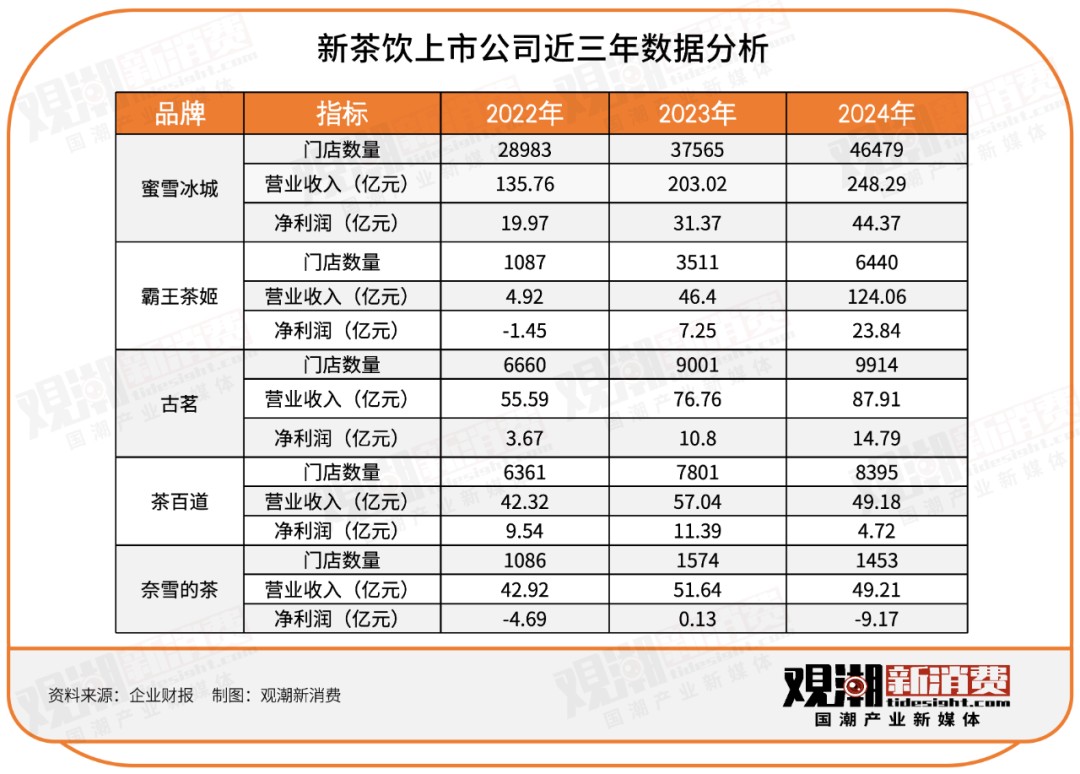 從業績來看,霸王茶姬 2024 年營收為 124.06 億元,相當於蜜雪冰城(248.29 億元)的一半,是古茗(87.91 億元)的 1.5 倍;霸王茶姬 2024 年淨利潤為 25.15 億元,相當於蜜雪冰城(44.54 億元)的 56.47%,是古茗(14.93 億元)的 1.68 倍。