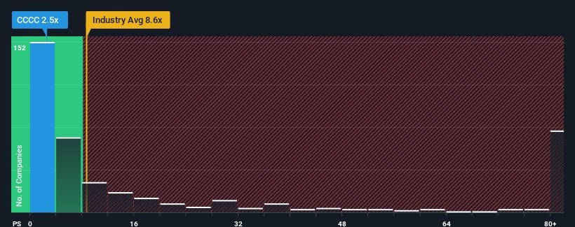 After such a large drop in price, C4 Therapeutics may look like a strong buying opportunity at present with its price-to-sales (or "P/S") ratio of 2.5x, considering almost half of all companies in the Biotechs industry in the United States have P/S ratios greater than 8.8x and even P/S higher than 51x aren't out of the ordinary. Although, it's not wise to just take the P/S at face value as there may be an explanation why it's so limited.
