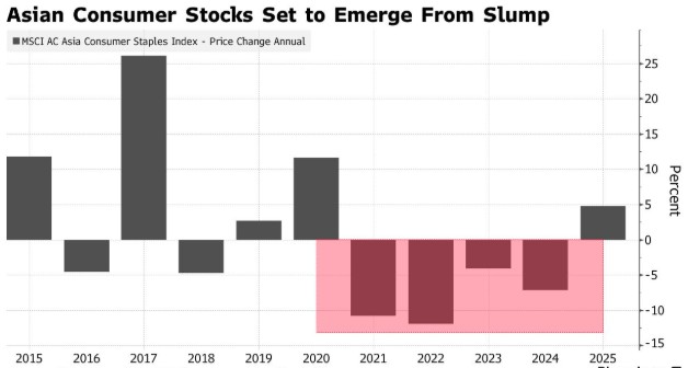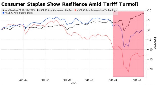 Although the protracted trade war will not spare any industry, consumer staples have shown resilience during economic pressures. This has also helped the sector benchmark index recover after four consecutive years of decline before 2024, while the MSCI Asia Information Technology Index has essentially risen for several consecutive years since 2019, indicating room for catch-up.