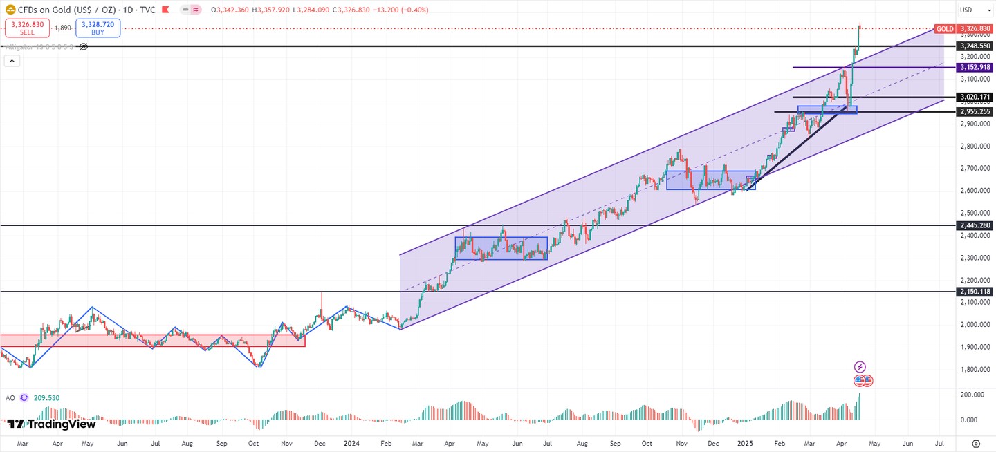 然而黃金這一階段中並未出現大幅回撤,甚至於 4 月 17 日進一步突破 3300 美元關口至歷史高位 3357.9 美元,儘管其後金價一度回落擊穿 3300 關口,但最終仍輾轉收復大部分失地,目前圍繞 3326 美元附近整理。
