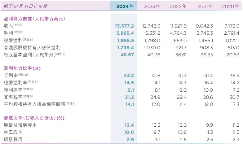 The company's overall expense ratio has not changed much. Although brand sponsorship and promotion expenses have been rising each year, this has been offset by optimization in employee costs. In 2024, the combined advertising and promotion expense ratio, employee expense ratio, and R&D expense ratio was 26.3%, an increase of about 0.7 percentage points compared to 2020. Operational efficiency also remains stable, with inventory turnover days optimized, accounts receivable turnover days showing significant fluctuations but offset by accounts payable cycles, resulting in an overall operational capital turnover period of 87 days in 2024, an increase of just 4 days year-on-year, unchanged compared to 2020.