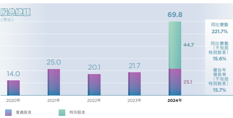 In addition, the company maintains a long-standing dividend policy, with the dividend amount for 2024 hitting a record high, proposing a final dividend of HKD 0.095 per share, bringing the total annual dividend to HKD 0.156, with a payout ratio of 50%. Additionally, a special dividend of HKD 0.447 per share will be distributed within the year, resulting in a year-on-year increase of 221.7% in total annual dividends, with the payout ratio more than doubling to 138.2%.