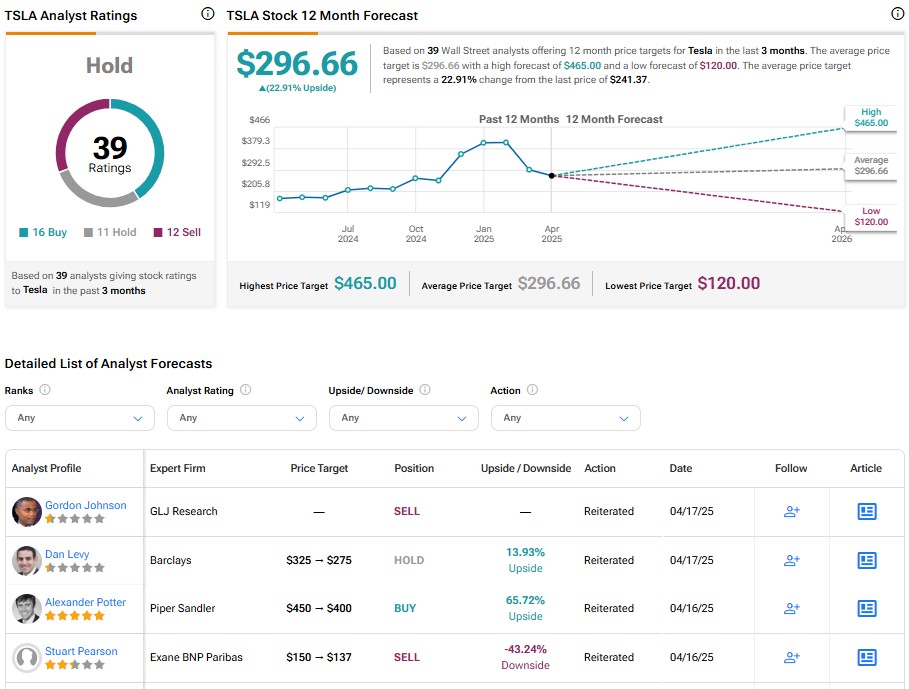 Turning to Wall Street, TSLA stock has a Hold consensus rating based on 16 Buys, 11 Holds, and 11 Sells assigned in the last three months. At $306.14, the average Tesla price target implies a 21.29% upside potential.