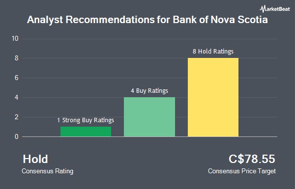 Shares of The Bank of Nova Scotia (TSE:BNS - Get Free Report) NYSE: BNS have been assigned a consensus recommendation of "Hold" from the thirteen brokerages that are presently covering the firm, MarketBeat.com reports. Nine research analysts have rated the stock with a hold recommendation, three have given a buy recommendation and one has issued a strong buy recommendation on the company. The average 1-year target price among brokers that have updated their coverage on the stock in the last year is C$76.09.