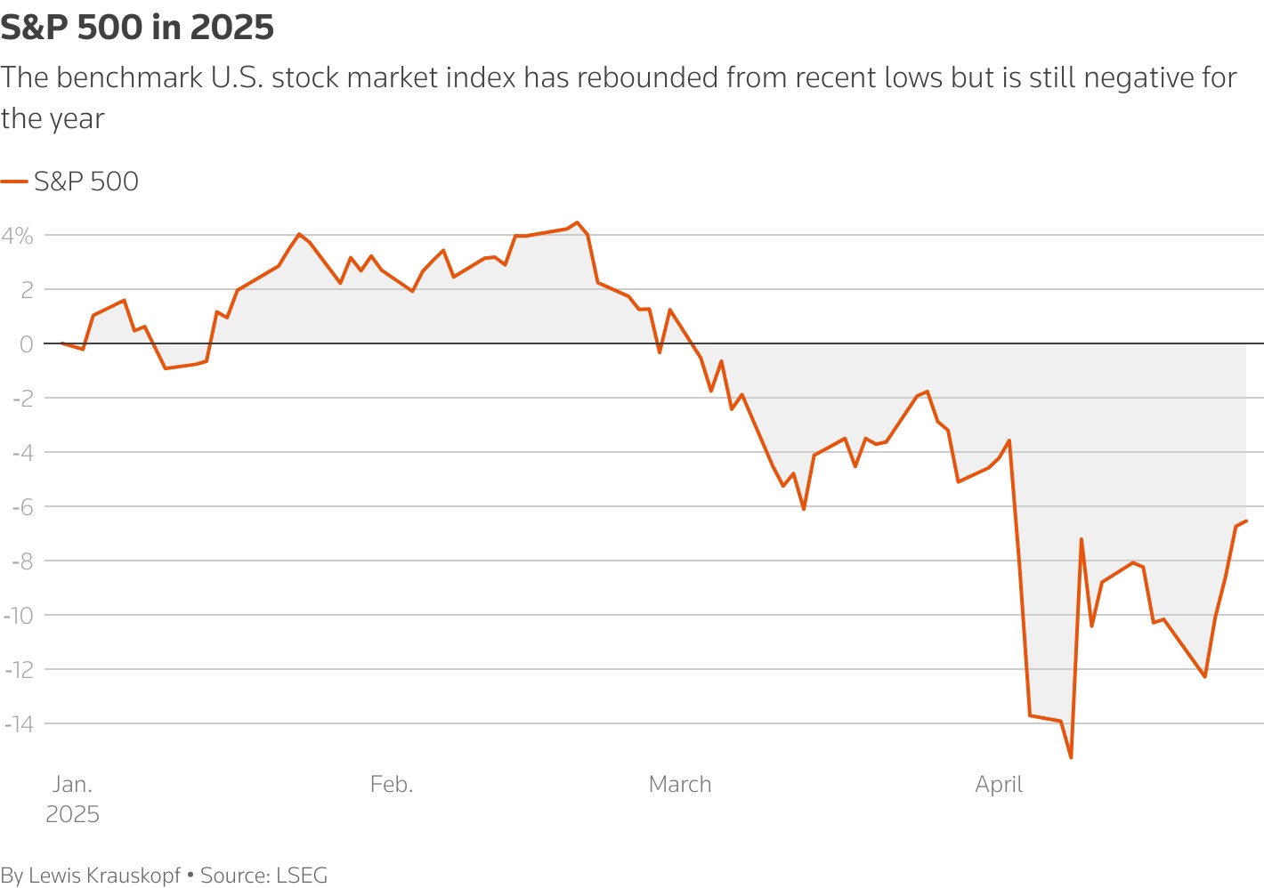 With the S&P 500 (.SPX) on pace for a solid week of gains, the U.S. benchmark index has pared its recent slide by about half but remains down some 10% from its February record high.
