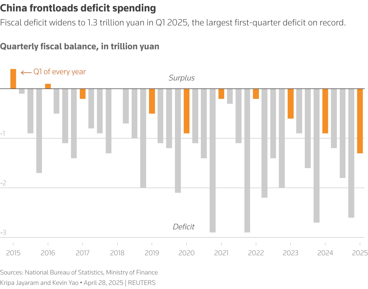 In January-March, government spending rose 4.2% from a year earlier, while revenue fell 1.1%, resulting in a fiscal deficit of 1.26 trillion yuan ($173 billion), the highest first-quarter reading on record, government data showed.