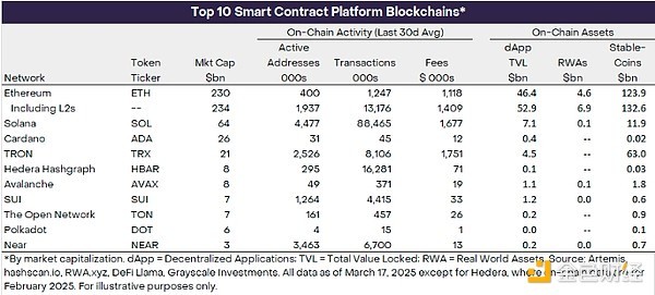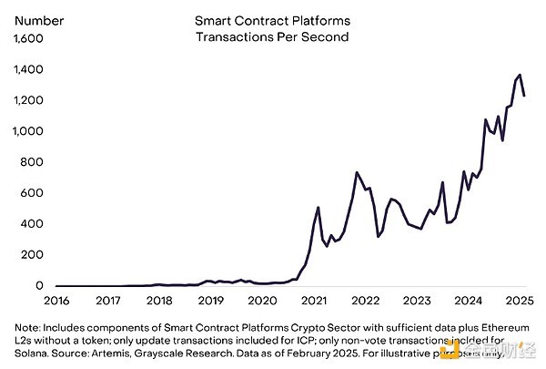 Grayscale Research believes that the adoption of smart contract-based applications will accelerate in the next 1-2 years, in part due to regulatory changes and upcoming legislation in the United States. The Trump administration has made changes to federal cryptocurrency policy that will be conducive to the industry investing and thriving in the United States. [3] In addition, a bipartisan group of senators introduced the Guiding and Establishing a United States Stablecoin National Innovation Act (GENIUS). Building on the efforts of the previous Congress, the bill seeks to provide a comprehensive regulatory framework for the issuance of stablecoins for payment purposes. Greater regulatory clarity will help increase investment in and adoption of blockchain-based applications, thereby increasing on-chain activity (e.g., transactions and fees) and ultimately the value of smart contract platform tokens.