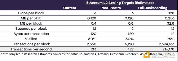 Future upgrades will continue to scale the L1 and L2 layers. The Pectra upgrade is scheduled for April 2025 and will combine enhancements from Prague (execution layer) and Electra (consensus layer). In terms of scalability, Ethereum Improvement Proposal 7691 optimizes Blob storage with a target of 6 Blobs per block, doubling Dencun's Blob capacity. Looking ahead, Ethereum's scalability potential may increase significantly with the implementation of the concept of "full Danksharding" (see Figure 8). [9] This upgrade will expand both the number of blobs per block and the size of each blob, significantly increasing the upper limit of TPS. Figure 8 shows how Pectra and full Danksharding may affect the transaction capacity of Ethereum’s L2 layer.