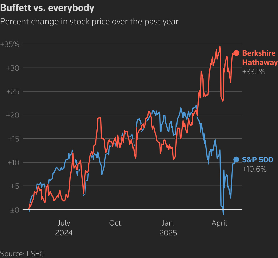 截至 4 月 30 日,伯克希爾的股價今年上漲了 18%,而標準普爾指數下跌了 5%,因為新的美國關税和經濟衰退擔憂動搖了市場。該企業的市值為 1.15 萬億美元。