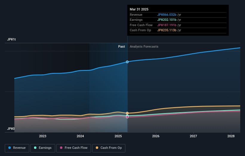 - Revenue: JP¥866.0b (up 14% from FY 2024).