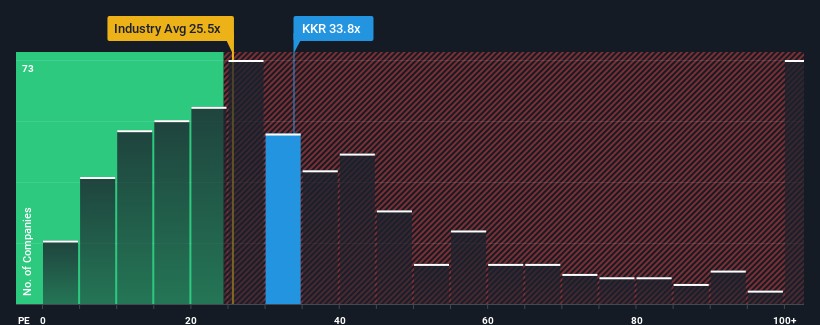 在價格堅挺反彈後,考慮到美國近一半的公司市盈率(或稱 "P/E")低於 17 倍,您可能會考慮完全避開 KKR,因為其市盈率為 33.8 倍。不過,僅僅根據市盈率來判斷並不明智,因為可能有解釋其如此高的原因。