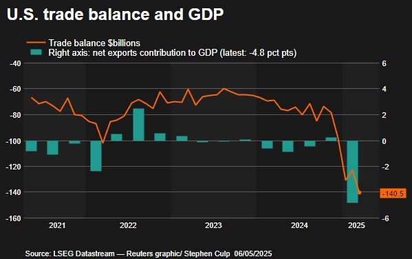 美國股市連續第二個交易日下跌,道瓊斯指數下跌 0.95%,標準普爾 500 指數下跌 0.77%,納斯達克指數下跌 0.87%。此次下跌受到關税不確定性以及特朗普總統和財政部長貝森特關於貿易協議的評論的影響。貿易逆差在 3 月份創下 1405 億美元的歷史新高,因為企業在關税公告前增加了進口。醫療保健行業表現最弱,禮來和 Moderna 等公司的股價顯著下跌。預計美聯儲將在為期兩天的會議上維持利率不變