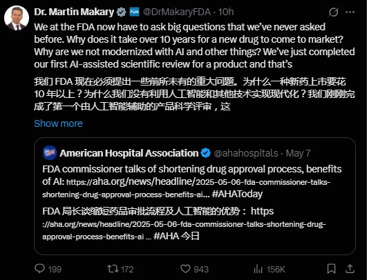 與此同時,週三,FDA 專員 Marty Makary 在 X 平台發文質問:
