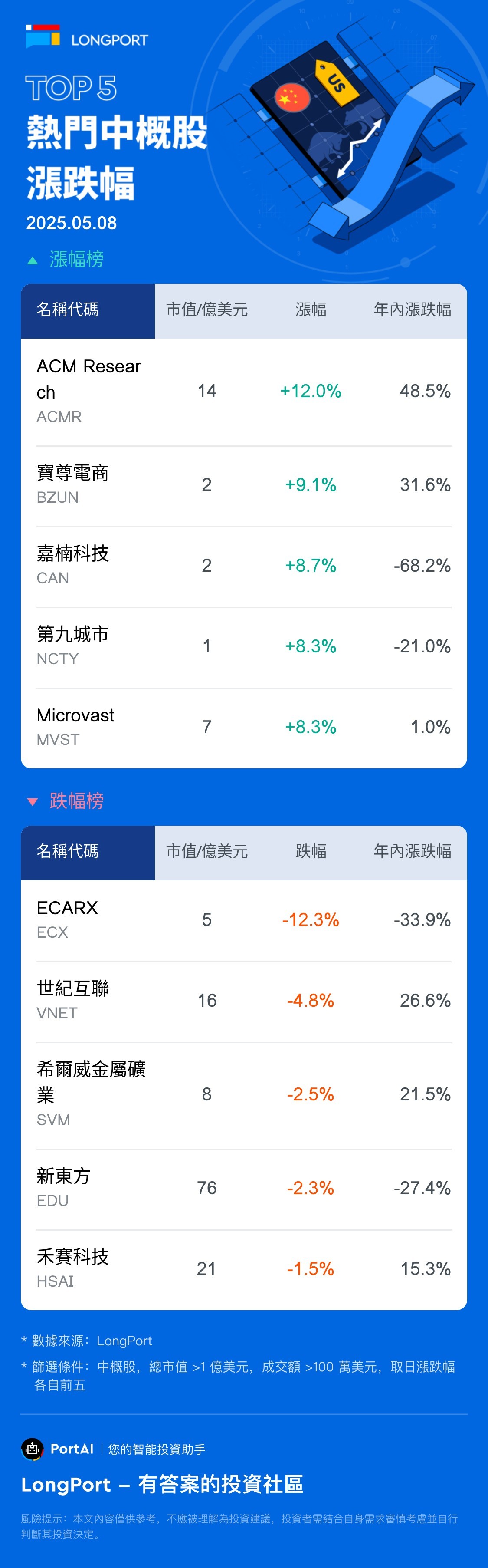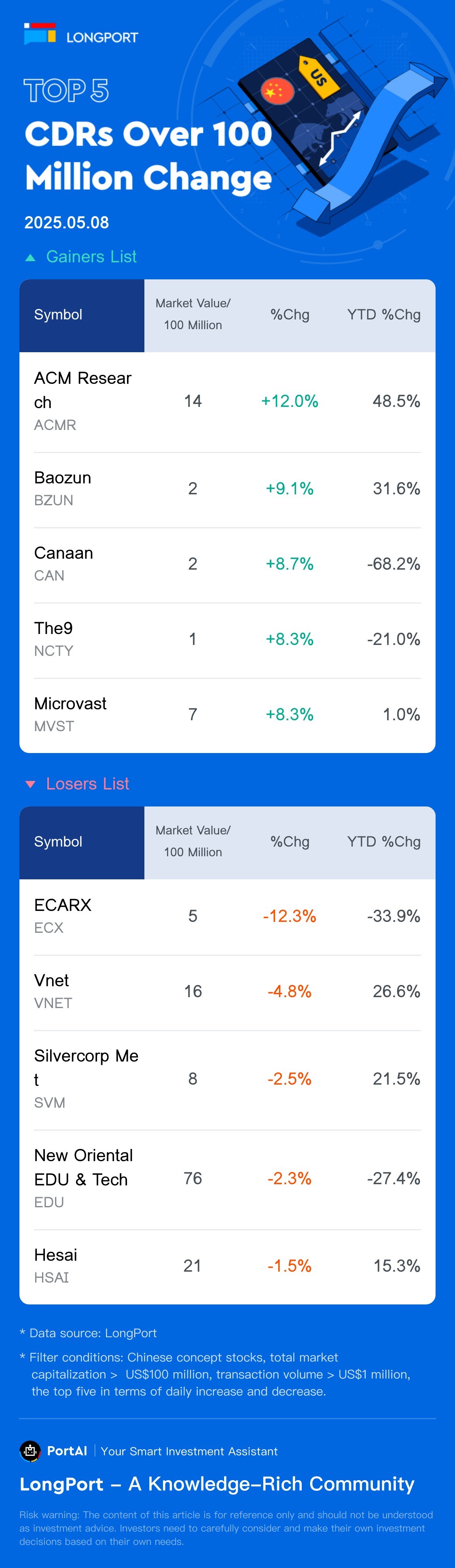 ACM Research(ACMR) rose 11.98%, with a trading turnover 53.2 Million USD, and a year-to-date rose 48.5%. Baozun(BZUN) rose 9.15%, with a trading turnover 3.7 Million USD, and a year-to-date rose 31.6%. ECARX(ECX) fell 12.26%, with a trading turnover 4.0 Million USD, and a year-to-date fell 33.9%. Vnet(VNET) fell 4.76%, with a trading turnover 78.2 Million USD, and a year-to-date rose 26.6%.