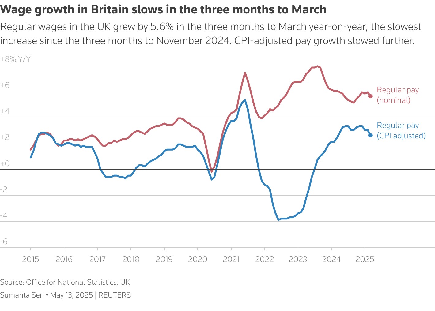 在截至 4 月份的三個月裏,職位空缺數量下降了 4.2 萬個,創下一年多來的最大降幅,總數降至 76.1 萬個,進一步低於大流行前的水平。與此同時,英國 3 月剔除紅利三個月平均工資——英國央行追蹤的用於衡量國內通脹壓力的指標——同比增長 5.6%,不及經濟學家預期的 5.7% 和前值 5.9%,為截至去年 11 月以來的三個月最低增幅。