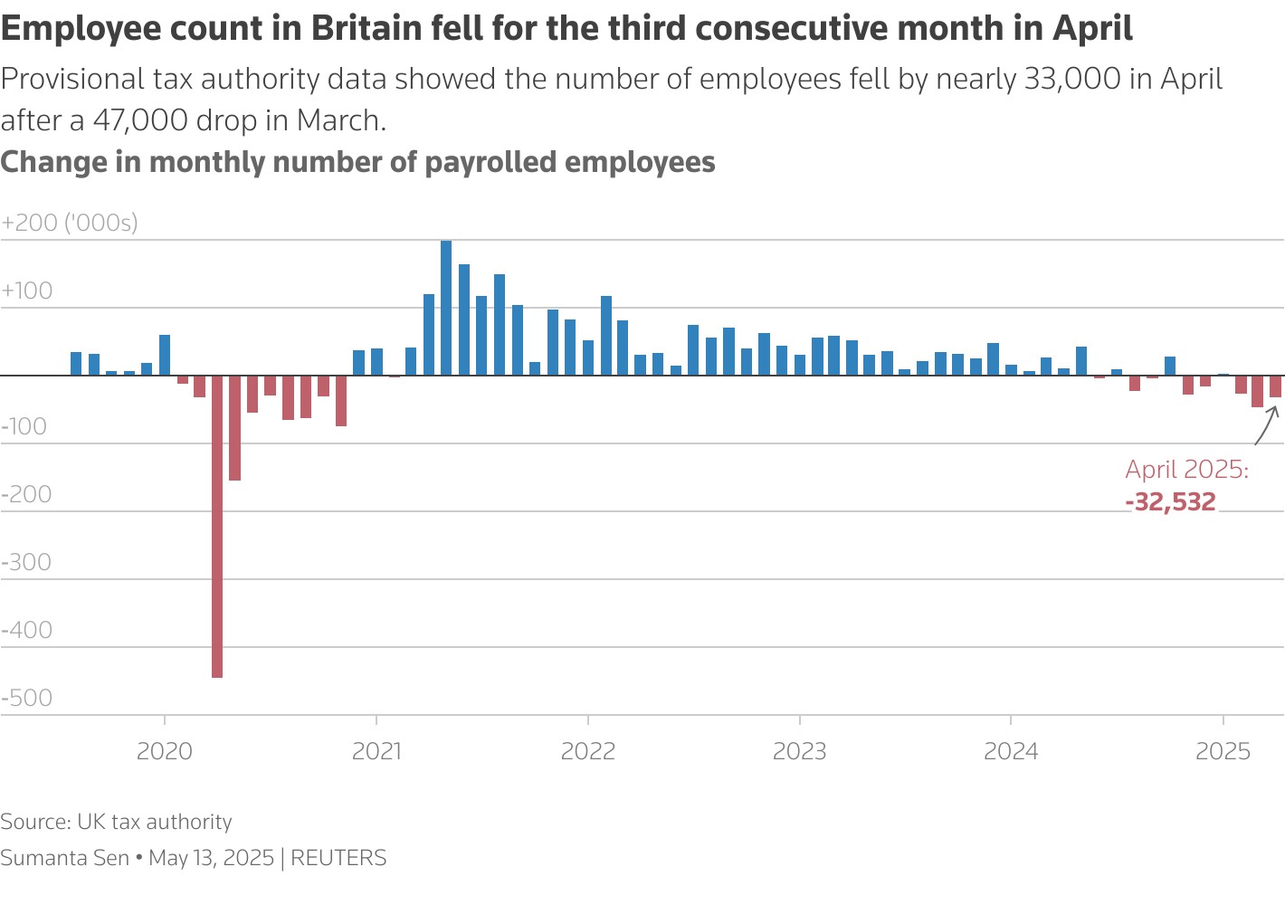 智通財經 APP 獲悉,由於增税給僱主帶來的負擔以及美國政府關税的影響,英國就業市場在上個月再次降温,這可能會讓英國央行在通脹壓力減弱方面感到些許安心。週二公佈的臨時税務局數據顯示,繼 3 月份僱員人數減少 4.7 萬人之後,4 月份僱員人數減少了近 3.3 萬人。