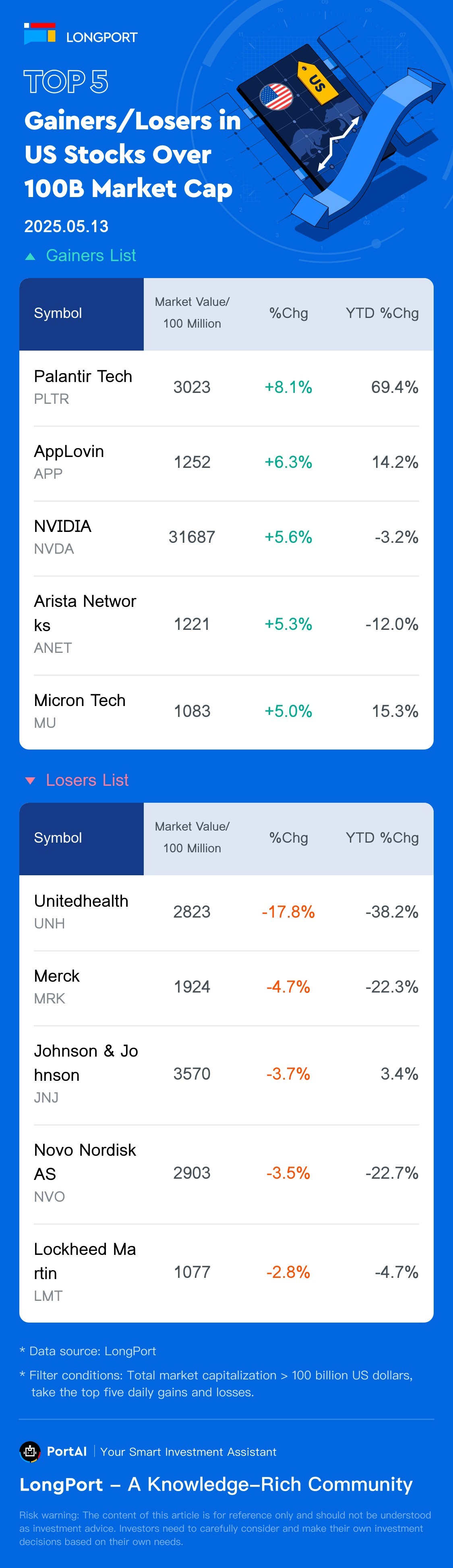 Top 5 US Stock Gainers/Losers (>100B) (5.13)