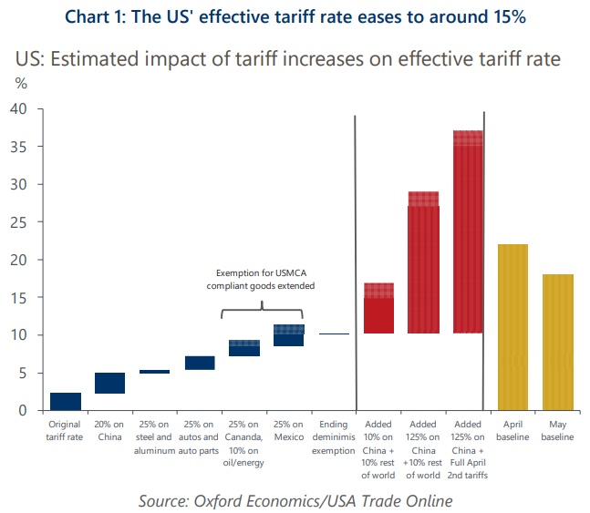 Estimates vary, but the general view is that the global average effective tariff rate will be somewhere in the 13-18% range, down 10 percentage points from before the weekend truce but still the highest since before the Second World War, and significantly higher than 2.3% at the end of last year.