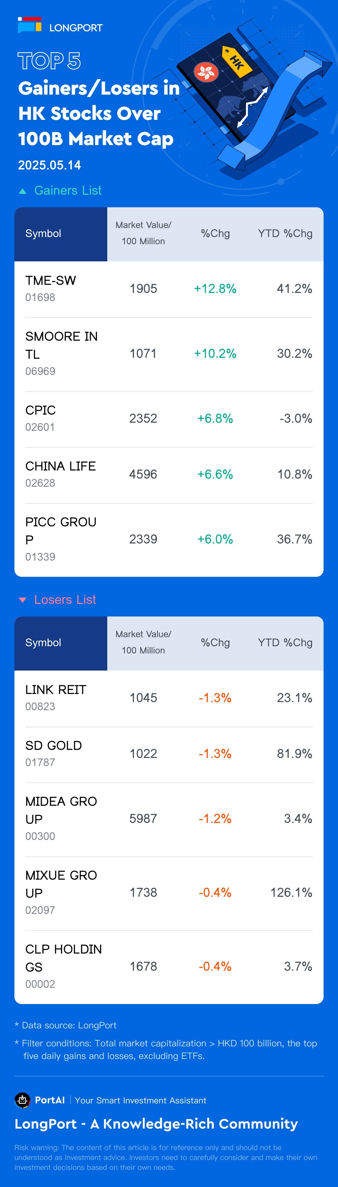 Top 5 HK Stock Gainers/Losers (>100B) (5.14)