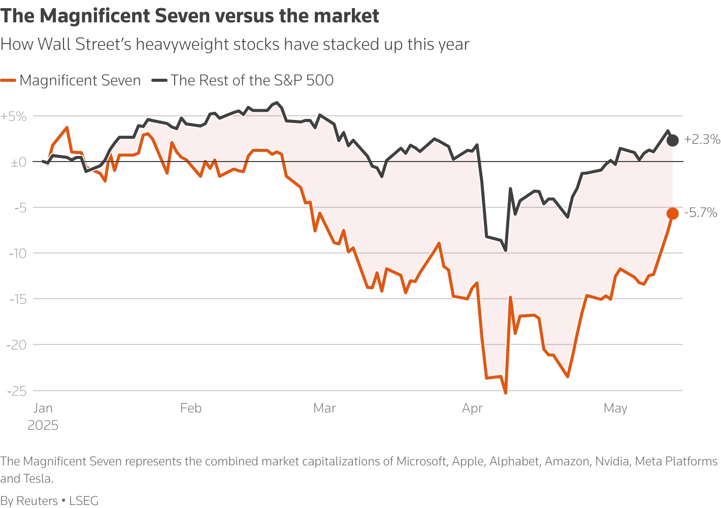 If the Mag 7 were a major drag on the broader S&P on the way down earlier this year, they're proving to be a major boon on the way back up. Most world indices have recovered the bulk of the losses triggered by the April 2 "Liberation Day" sell-off. Since then, the Roundhill Magnificent 7 exchange-traded fund MAGS.K has gained 11%, far outpacing the 4.5% rise in the S&P 500 since then. By contrast, the equal-weight S&P, which strips out the oversized influence of the megacaps, is barely up 1%.