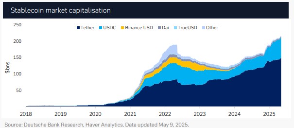 The research, co-authored by Marion Laboure and Camilla Siazon, points out that the total market size of stablecoins has surged from $20 billion in 2020 to $246 billion by May 2025, with Tether (USDT) alone growing from $67 billion in June 2022 to over $149 billion by May 2025.